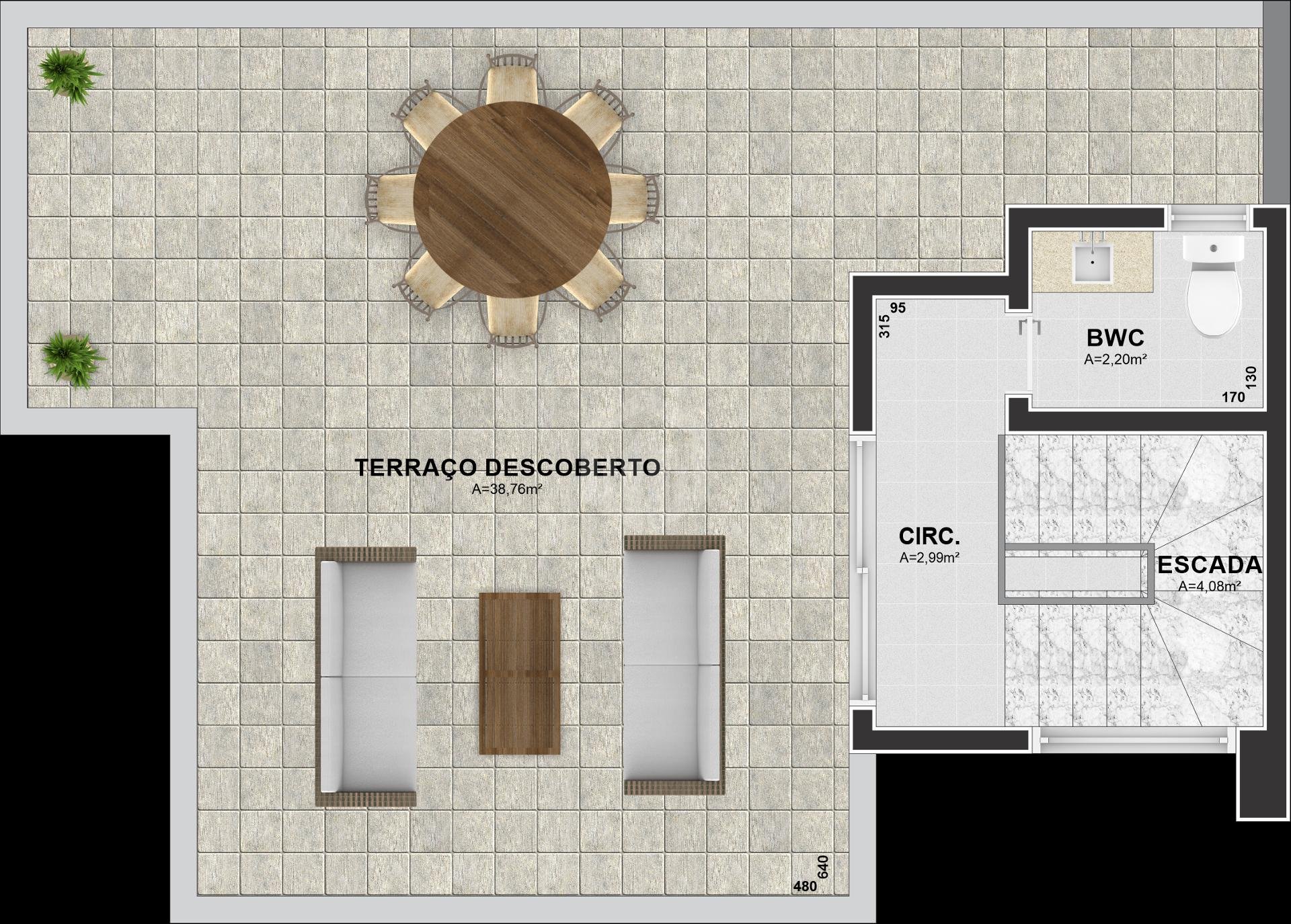 No último pavimento, um amplo terraço surpreende: oferece uma sala adicional e banheiro, com estrutura pronta para jacuzzi. Um espaço versátil, ideal para criar um lounge privativo, área gourmet ou ambiente de relaxamento com vista.