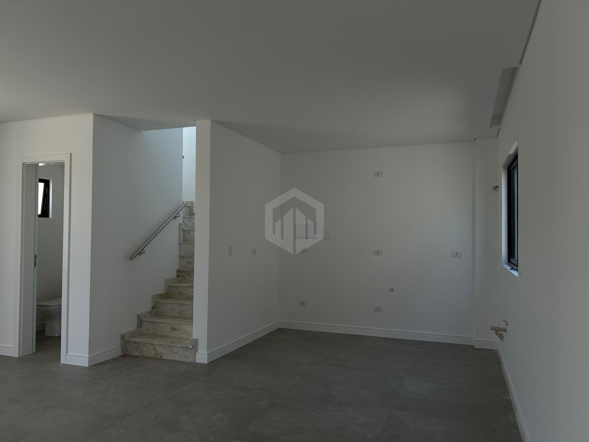 - Acabamentos em porcelanato e escada em mármore branco Paraná